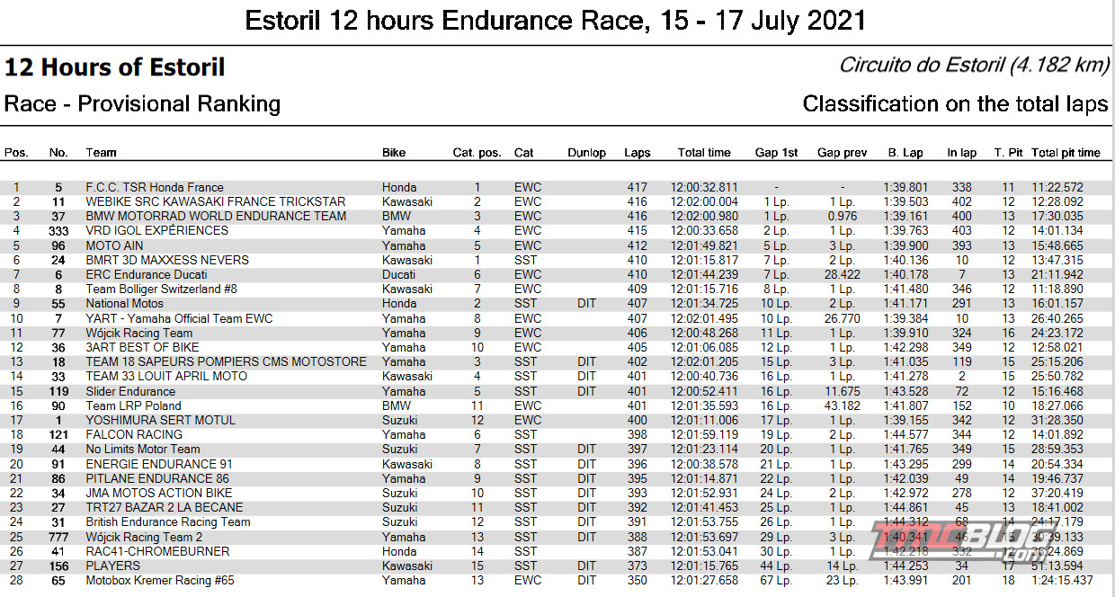 Tiba akhirnnya pada Akhir jam ke 12 dari race ini team FCC TSR Honda yang terdiri dari pembalap Yuki Takahashi, Josh Hook, dan Mike Di Meglio berhasil memenangkan Race endurance Estoril 12H. SRC Kawasaki France ( Jérémy Guarnoni, Erwan Nigon dan David Checa) finish di Posisi dua menggunakan Kawasaki ZX-10RR diikuti Oleh BMW Motorrad World Endurance Team (Javier Forés, Markus Reiterberger dan Kenny Foray)