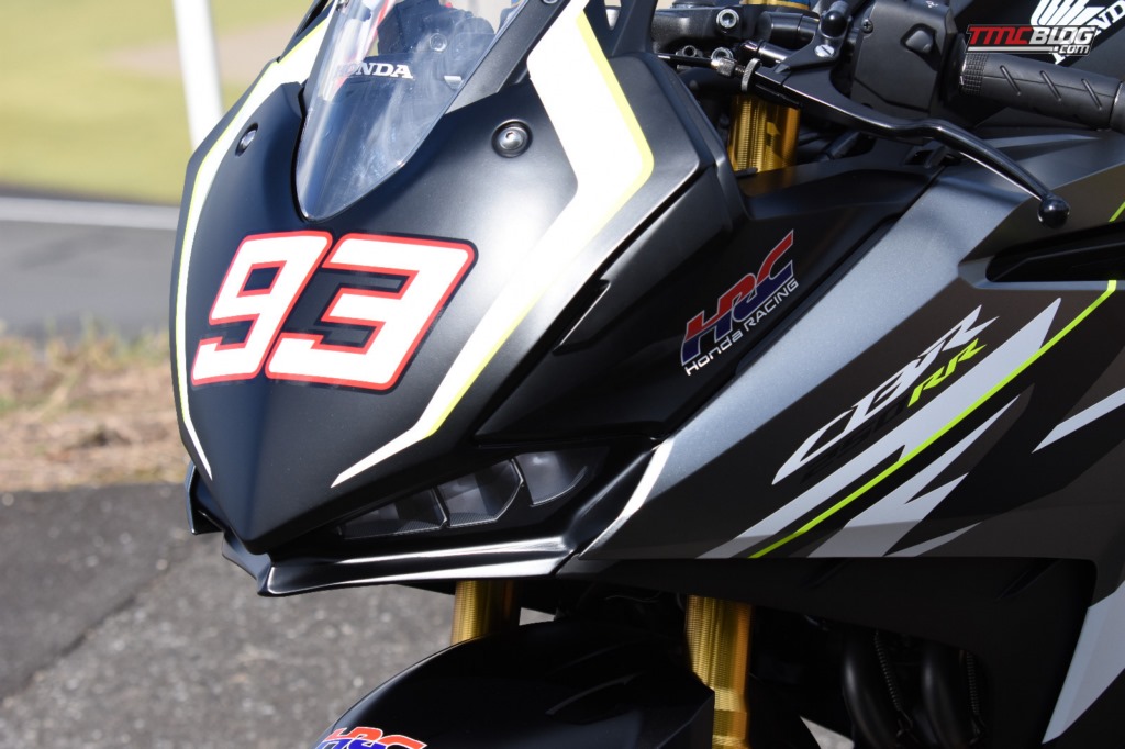liputanindo.com – Marc Marquez tampil di Honda Plaza sirkuit Motegi Sembari naik New Honda CBR250R berwarna hitam dengan livery khas HRC terbaru di sekujur body-nya. Secara Standar CBR250RR ini terlihat menggunakan body dan fairing Spesifik balap tanpa adanya parts road Absah yang menempel. Juga knalpot yang sudah diganti dengan tipe free flow full system menggantikan knalpot standar model double muffler-nya.