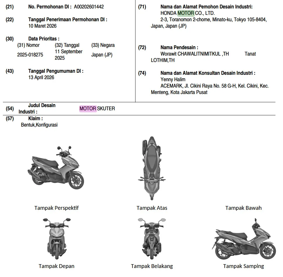 Baru-baru ini, sebuah data Informasi Formal Desain Industri dari Direktorat Jenderal Kekayaan Intelektual (DJKI) Kementrian Hukum RI terendus memperlihatkan pendaftaran desain terbaru dari prinsipal Honda Jepang (Honda Motor Co., Ltd). Dan Apabila kita perhatikan secara saksama, siluet dan garis desain tersebut identik dengan Honda Air Blade 2026 yang beberapa waktu Lampau sempat rilis di Vietnam.