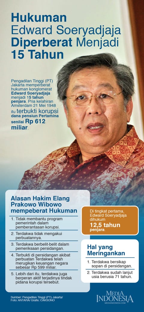 Infografis 05/12/2024 Hukuman Edward Soeryadjaja Diperberat Menjadi 15 Tahun Diposkan Oleh:administrator Hukuman Edward Soeryadjaja Diperberat Menjadi 15 Tahun Cek Artikel: Menteri Paling Banyak Diberitakan Media Selama 2022