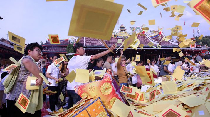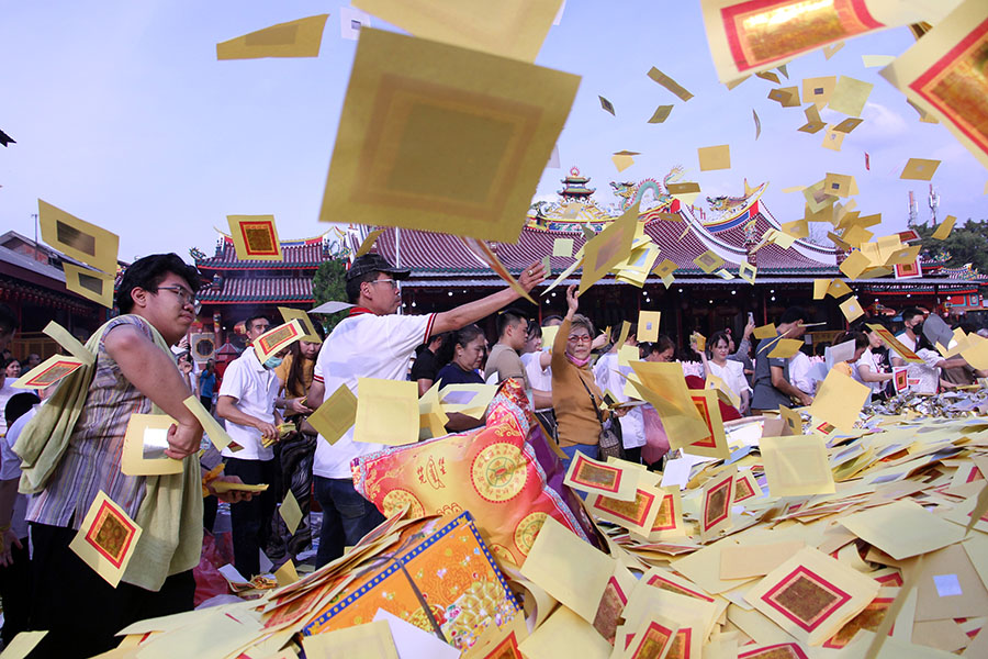 Anggota Tionghoa melempar kertas persembahan pada Perayaan Hungry Ghost di Wihara Gunung Timur, Medan, Sumatra Utara, Sabtu (6/9/2025). Perayaan Hungry Ghost merupakan tradisi Anggota Tionghoa yang dilakukan setiap tahun sekali sebagai bentuk memberi makan leluhur dan dipercaya menjadi bekal bagi orang yang sudah meninggal. ANTARA/Yudi Manar/gus