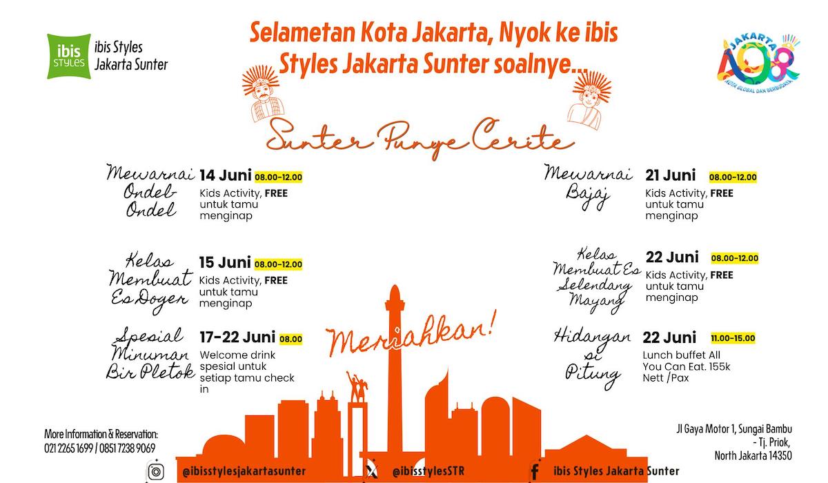 Jangan lewatkan giveaway spesial HUT Jakarta melalui Instagram @ibisstylesjakartasunter yang berlangsung dari 19–26 Juni 2025. Hadiahnya meliputi voucher menginap, voucher berenang, dan voucher bermain billiard gratis. (Z-10)