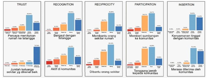 Eksis lima variabel utama yang kami gunakan untuk mengukur tingkat kohesi sosial di Jakarta, yakni trust, recognition, reciprocity, participation, dan insertion. Tiap-tiap variabel dipecah menjadi 2 pertanyaan dengan opsi jawaban skala Likert. Total skor dari setiap pertanyaan kemudian diagregasi dalam Gambar 1. Hasil dari setiap variabel yang diukur menunjukkan secara cukup meyakinkan ikatan sosial yang kuat di antara warga Jakarta pada tingkat akar rumput. Misalnya, jumlah responden yang percaya menitipkan rumah kepada tetangga sangat tinggi. Kecenderungan sama terlihat di variabel insertion bahwa sebagian besar responden merasa nyaman tinggal bersama komunitas di mana mereka berada. Dari seluruh pertanyaan, yang nilainya cukup rendah ialah aspek keterlibatan di komunitas, yakni ada sekitar 19%. Poin ini akan kami angkat lagi di bagian belakang tulisan.