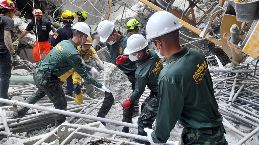 Petugas gabungan Thailand berada di area terdampak gempa bumi. (Anadolu Agency)