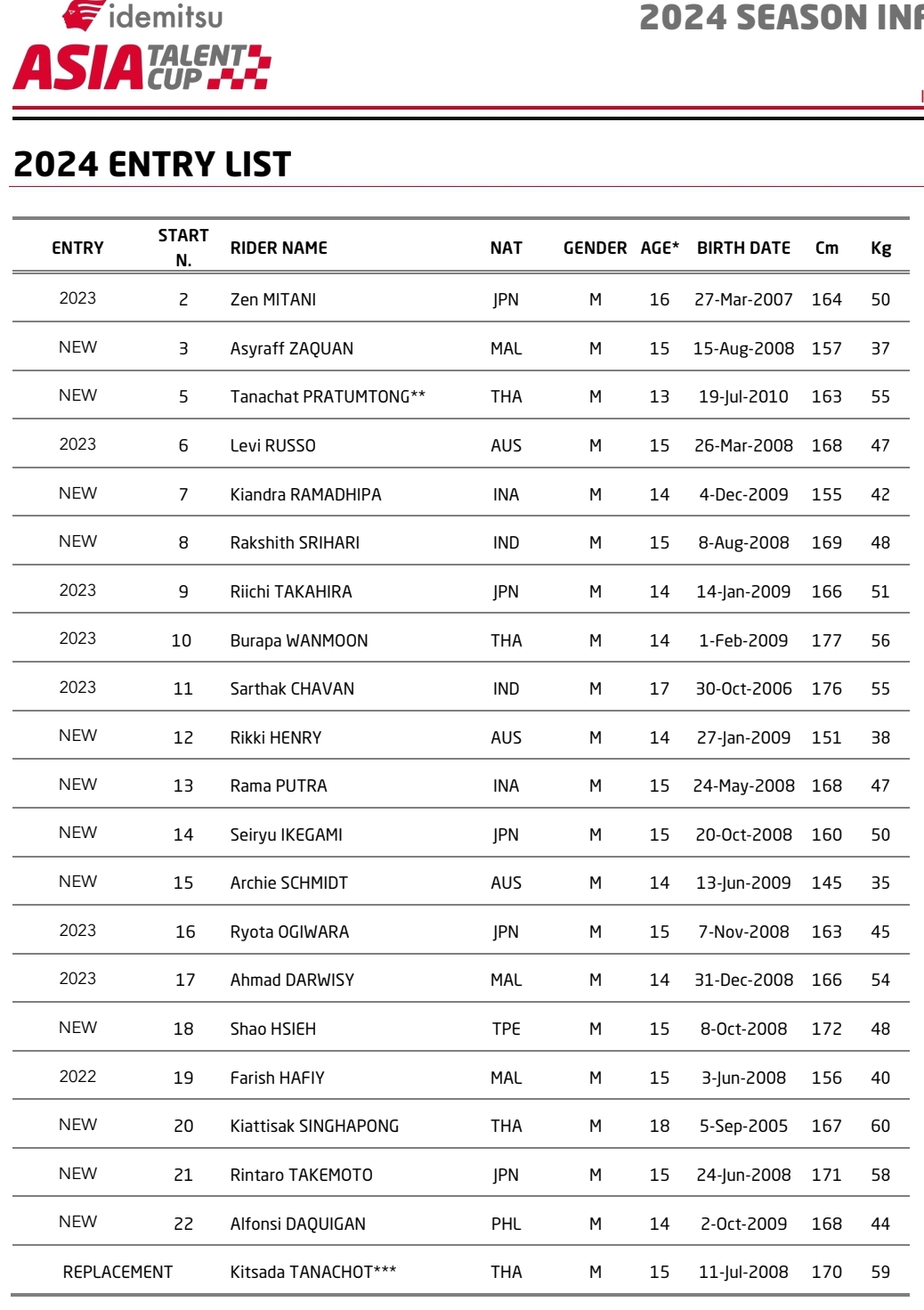 Pembalap Pelan yang kembali tampil termasuk peraih medali perunggu 2023 Ryota Ogiwara, tempat kelima Zen Mitani dan tempat keenam Riichi Takahira. Ketiga takenta Muda Asal Jepang ini akan menuju musim 2024 sebagai pembalap yang harus dikalahkan. Seperti trio Jepang, Farish Hafiy dari Malaysia adalah salah satu pemain yang kembali dan finis di 10 besar musim Lewat, jadi Persona-Persona yang familiar akan memberikan tolak ukur yang fantastis bagi pendatang baru.