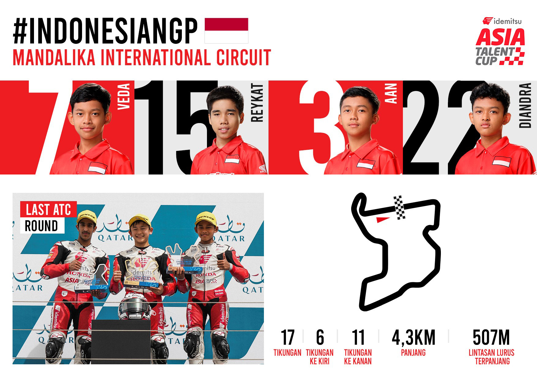 Empat pembalap Indonesia yang didukung Astra Honda Motor akan menjalani balapan kandang dan melanjutkan performa bagus yang sudah ditunjukkan Ketika menjalani putaran pembuka di Qatar, dua pekan Lampau. Reykat Yusuf Fadillah dan Veda Ega Pratama sudah punya pengalaman membalap di Mandalika ketika tahun Lampau mendapatkan fasiltas wildcard, dengan hasil terbaik masing-masing finis di posisi kelima dan kedelapan.
