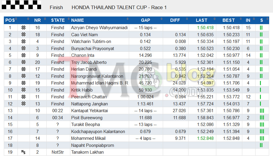 Dan akhirnnya race 1 TTC Seri Buriram 2019 ini dimenangkan Oleh Pembalap Indonesia Azryan Dheyo diikuti pembalap Vietnam bernama Cao Viet-Nam dan Pembalap Thailand Watcharin Tub Tim-On . Indonesia berkumandang menutup sesi sabtu ARRC Seri 3 Via Kelas tambahan TTC yang dipersembahkan Azryan Dheyo. Herlian Dandy finish di posisi tujuh , Kita akan saksikan race2nya esok hari sob. Semoga Bermanfaat