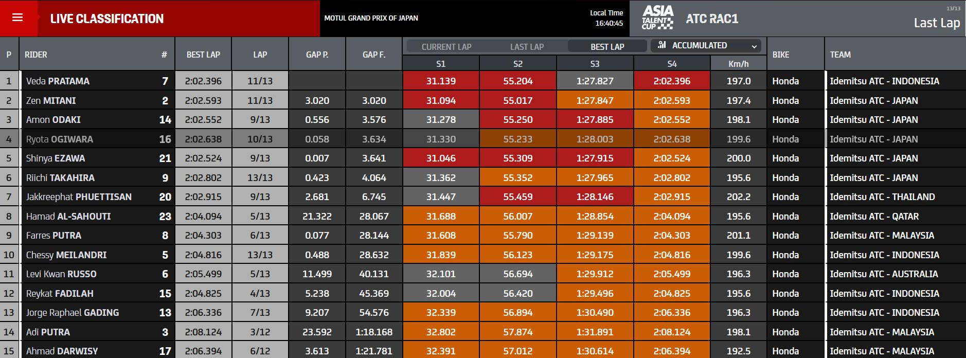 Awal lap ke 12 Veda memimpin Balapan dengan jarak 1,5 detik dari Odaki setelah menorehkan 2:02,396 . Awal Lap terakhir Veda Lagi memimpin sejauh 2,4 detik dari empat pembalap Jepang yang berebut sisa dua podium . Setelah 13 Lap Pembalap Indonesia Veda Ega Pratama memenangkan race 1 Asia Talent Cup Motegi 2023. Indonesia Raya berkumandang. Chessy Meilandri Finish Di Posisi 10.