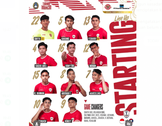 Empat perubahan tersebut Merukapan Rafael Struick, Kakang Rudianto, Rayhan Hannan, dan kiper Daffa Fasya yang bermain sejak menit pertama melawan Laos ini.