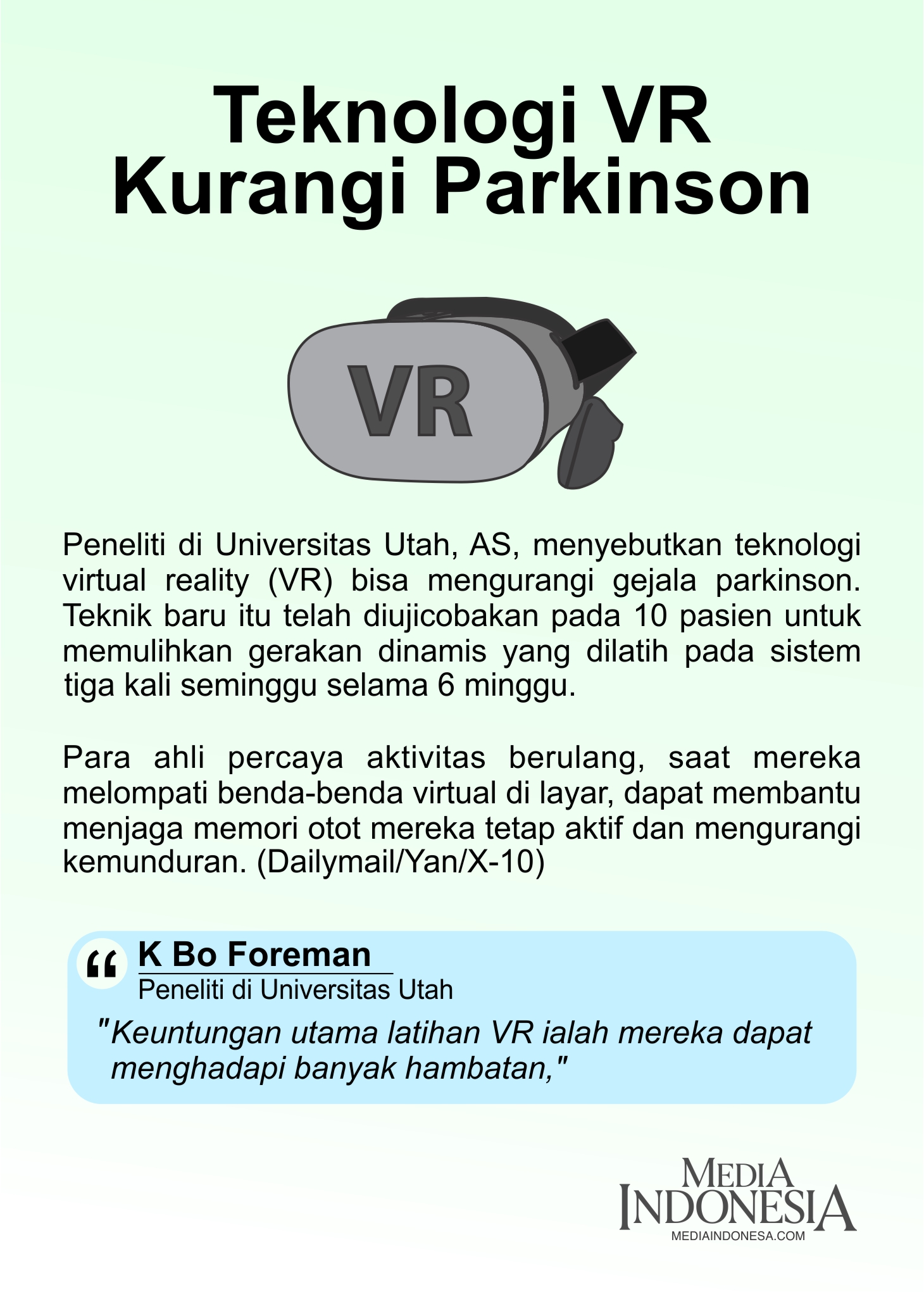 Infografis 14/05/2025 INFO GRAFIS Teknologi VR Kurangi Parkinson Diposkan Oleh:administrator Infografis(Grafis: Beni Agus Widodo) Berikut adalah data penelitian yang dilakukan oleh K Bo Foreman, peneliti di Universitas Utah tentang penyakit Parkinson. Cek Artikel: Pergerakan Sejumlah Harga Komoditas Pangan