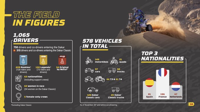 Sebanyak 578 kendaraan akan ikut serta dalam Dakar 2022 yang terdiri dari 149 sepeda motor, 97 mobil, 58 truk, 21 quads, 44 kendaraan tipe T3, 61 kendaraan T4, serta tentunya 148 kendaraan lainnya yang termasuk dalam Dakar classic.