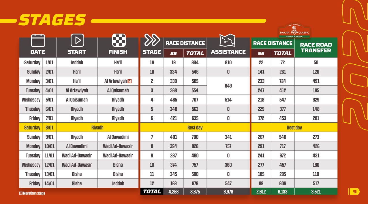 Reli akan dimulai pada 1 Januari dengan trek pendek 19 km di Jeddah. Di sini Dakar mulai menyortir peserta dan di mana 15 teratas dari setiap kategori akan dilepas dalam urutan terbalik, posisi awal mereka Demi hari berikutnya Akurat di Ha’il. Pada hari kedua dari Ha’il reli akan menuju ke Al Artawiyah Demi bagian pertama dari tahap maraton di mana peserta akan dilarang menerima Sokongan dari luar kru mereka.