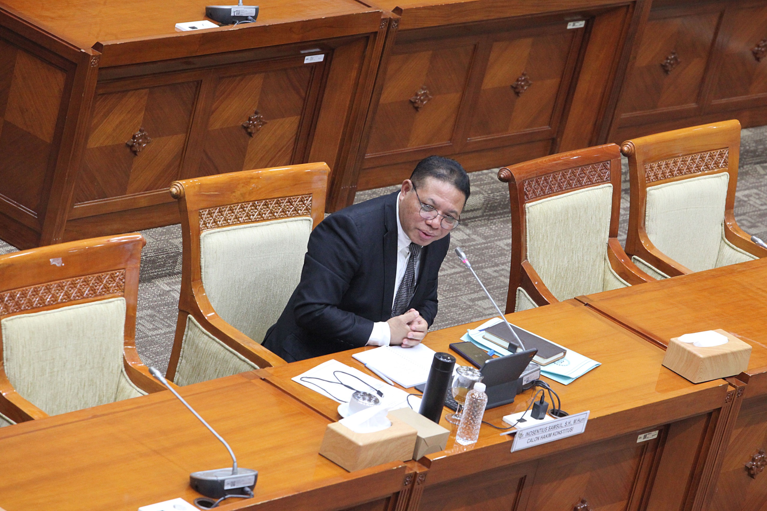 Pejabat Fungsional Perancang Undang-undang Spesialis Primer di Badan Keahlian DPR Inosentius Samsul menyampaikan paparan Ketika mengikuti uji kompetensi dan kelayakan calon hakim konstitusi di Komisi III DPR, Kompleks Parlemen, Senayan, Jakarta, Rabu (20/8/2025). Inosentius Samsul menjadi calon hakim konstitusi menggantikan Arief Hidayat yang akan berakhir masa tugasnya pada 3 Februari 2026 karena memasuki usia 70 tahun.