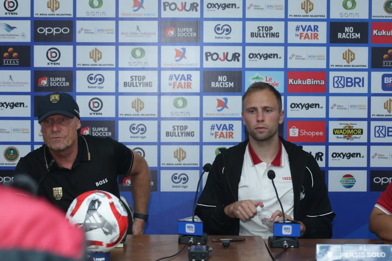 Liputanindo.id – Instruktur Persis Solo, Peter de Roo (kiri) dan bek Xandro Schenk (kanan) dalam press conference pascalaga Persis Solo melawan Madura United, Sabtu (9/8/2025) malam.
