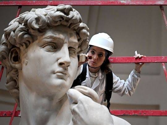 Senin lalu, saat museum tutup, pemulih pribadinya, Eleonora Pucci, menaiki perancah untuk melihat dari dekat –bagian dari ritual pemantauan dan pembersihan yang diperlukan untuk pelestarian ikon Renaisans yang dikunjungi oleh lebih dari dua juta pengunjung tahun lalu itu. Terlepas dari ketampanan David dan warisan Alkitab, pembunuh Goliat perlu perawatan.