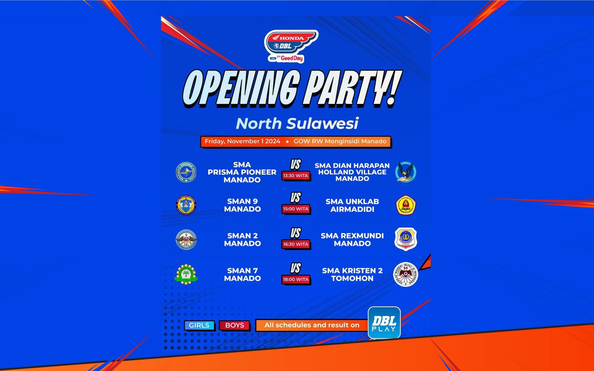 Opening Party Honda DBL with Kopi Good Day 2024 North Sulawesi siap menggebrak GOR RW Monginsidi Manado pada Jumat, 1 November 2024. Sebanyak empat pertandingan sektor putra bakal menyemarakkan kompetisi basket pelajar yang sedang bergerak ke kota Manado ini.