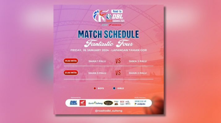 Adalah SMAN 1 Palu, SMKN 3 Palu, SMAN 3 Palu, dan SMAN 2 Palu. Di pertandingan DBL Palu hari kelima, sederet pertandingan bakal dimulai pukul 19.00 WITA. Dan dipastikan laga ramai.