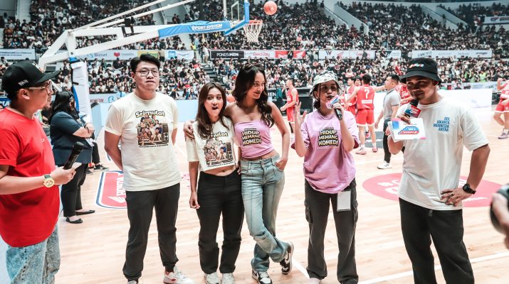 Jajaran pemain Gambar hidup Srimulat: Hidup Memang Komedi sambangi perhelatan Final Honda DBL with Kopi Good Day 2023 DKI Jakarta Series di Indonesia Arena pada Jum’at, 17 November 2023. Kehadiran mereka Benar Begitu sesi pemanasan laga antara SMA Jubilee Jakarta melawan SMA Bukit Sion Jakarta (Buksi)