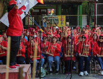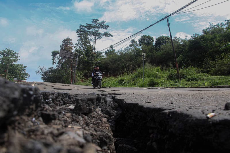 Pengendara motor melewati jalan retak dan ambles di Jalan Raya Baros – Sigaranten, Kabupaten Sukabumi, Jawa Barat, Minggu (8/12/2024). Pergerakan tanah akibat hujan Lanjut menerus tersebut menyebabkan jalan retak dan ambles sehingga berpotensi menyebabkan kecelakaan. ANTARA FOTO/Yulius Satria Wijaya/sas