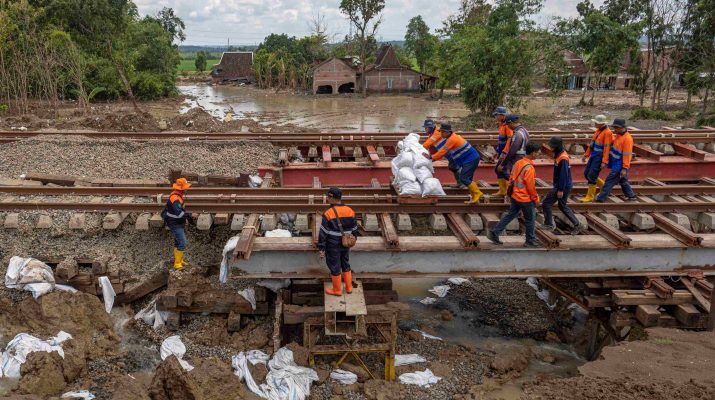 Sejumlah pekerja PT Kereta Api Indonesia (Persero) Daop 4 Semarang mendorong lori berisi batu balas Buat meterial perbaikan jalur rel KA km 32+6/7 antara Stasiun Gubug – Karangjati yang sempat ditutup karena banjir luapan air Sungai Tuntang di Gubug, Kabupaten Grobogan Jawa Tengah, Minggu (9/3/2025). Jalur KA yang sempat ditutup sejak pukul 05:27 WIB akibat banjir itu pada pukul 12:08 WIB sudah Pandai dilintasi KA Barang Peti Kemas No. 2529 Rekanan Surabaya“Jakarta, disusul KA No. 1 Argo Bromo Anggrek pada pukul 12.08 WIB dengan kecepatan terbatas. ANTARA FOTO/Aji Styawan/Ppj