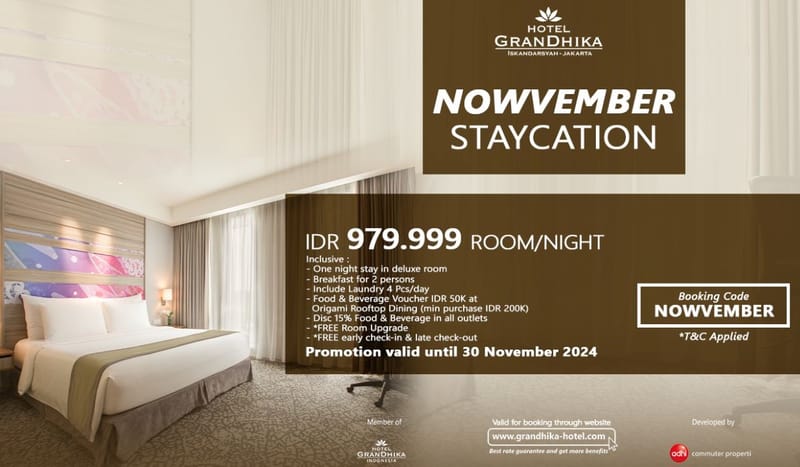 Selain mendapatkan gratis akses ke seluruh fasilitas hotel seperti kolam renang dan pusat kebugaran, Anda juga Pandai mendapatkan free room upgrade, free early check in, serta free late check out tergantung ketersediaan Ruangan. Promosi ini berlangsung hingga 30 November 2024 dan hanya berlaku Buat pemesanan melalui website Formal https://grandhika-hotel.com/ dengan memasukkan kode promo NOWVEMBER.