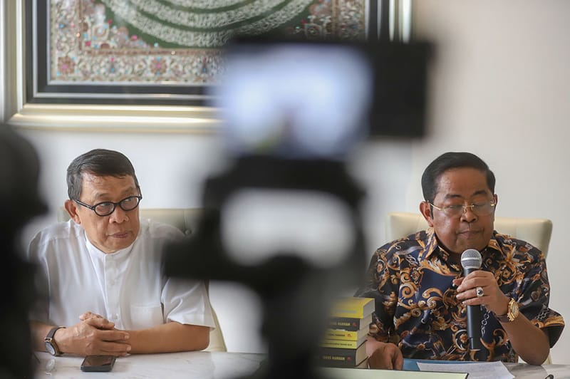 Ketua Dewan Pembina Bappilu Partai Golkar Idrus Marham (kanan) memberikan keterangan pers terkait dinamika menjelang Munas ke XI Partai Golkar di Jakarta, Senin (19/8/2024). Idrus mengungkapkan pemilihan Ketua Lumrah Partai Golkar pada Munas harus senantiasa mengedepankan musyawarah mufakat terlebih dahulu. MI/Usman Iskandar