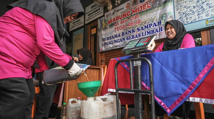 Pengurus Bank Sampah Beo Asri melakukan penimbangan minyak jelantah atau used cooking oil (UCO), yang dikumpulkan oleh Penduduk di Kelurahan Tegalreja, Cilacap, Jawa Tengah, Rabu (18/6/2025). Pengumpulan minyak jelantah yang dijadikan bahan baku pengolahan Bioavtur 3.0 tersebut, merupakan bagian dari Ekosistem Pengembangan Sustainable Aviation Fuel (SAF) yang dikembangkan oleh Pertamina di PT Kilang Pertamina Dunia (KPI) Unit Cilacap. ANTARA/Idhad Zakaria/gus