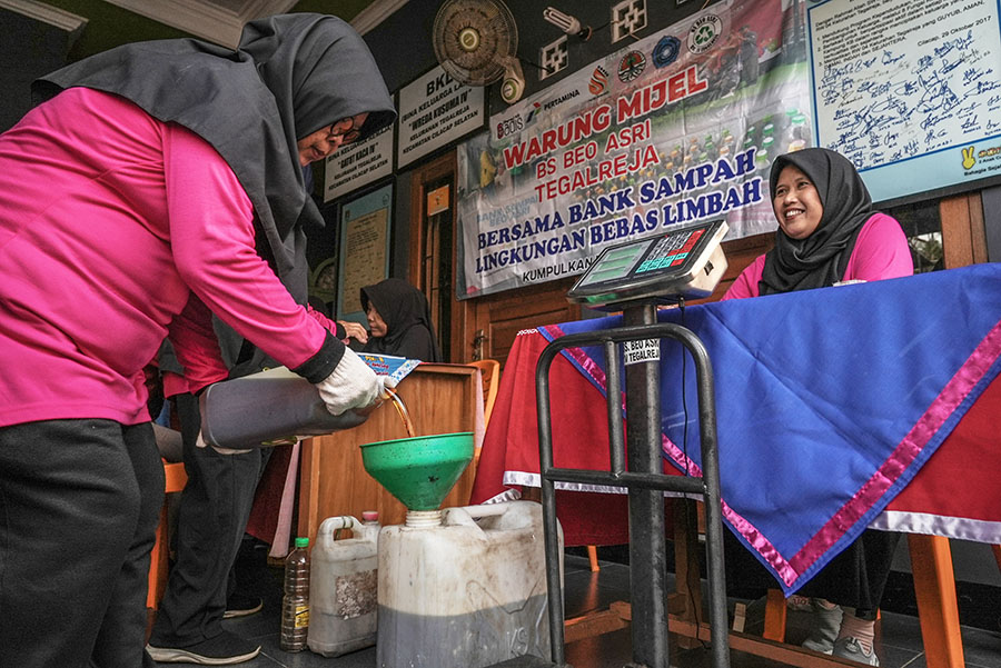 Pengurus Bank Sampah Beo Asri melakukan penimbangan minyak jelantah atau used cooking oil (UCO), yang dikumpulkan oleh Penduduk di Kelurahan Tegalreja, Cilacap, Jawa Tengah, Rabu (18/6/2025). Pengumpulan minyak jelantah yang dijadikan bahan baku pengolahan Bioavtur 3.0 tersebut, merupakan bagian dari Ekosistem Pengembangan Sustainable Aviation Fuel (SAF) yang dikembangkan oleh Pertamina di PT Kilang Pertamina Dunia (KPI) Unit Cilacap. ANTARA/Idhad Zakaria/gus