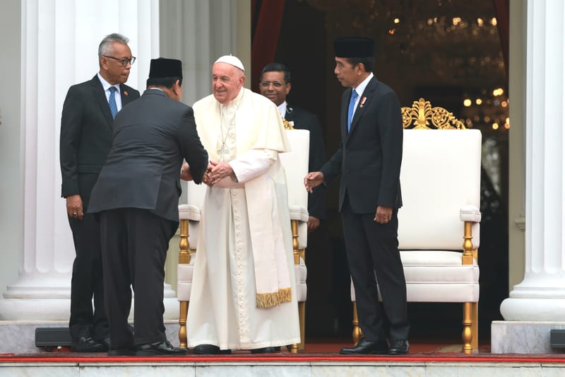 DI tengah kunjungan Kenegaraan Pemimpin Tertinggi Umat Katolik Dunia, Sri Paus Fransiskus, ke Istana Kepresidenan RI di Jakarta, Presiden Joko Widodo memperkenalkan Presiden Terpilih Prabowo Subianto dan para menteri kabinet.