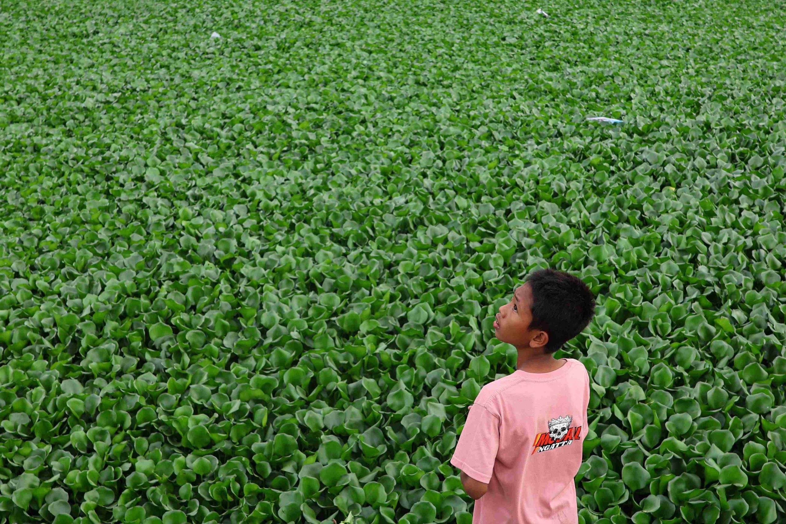 Anggota beraktifitas di dekat kanal yang dipenuhi tanaman eceng gondok di Makassar, Sulawesi Selatan, Sabtu (23/8/2025). Penumpukan tanaman eceng gondok tersebut dapat menyebabkan pendangkalan serta merusak ekosistem air sungai. ANTARA FOTO/Arnas Padda/Ppj