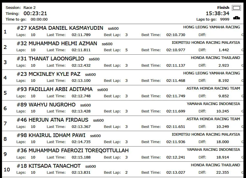 Hingga bendera finish dikibarkan, Kasma Daniel tak terbendung dan berhasil membawa Yamaha R6 memenangkan Race 2 SS600 ARRC Sepang 2026. Ia diikuti oleh Helmi Azman di posisi kedua dan Thanat Laoongplio yang melengkapi podium ketiga.