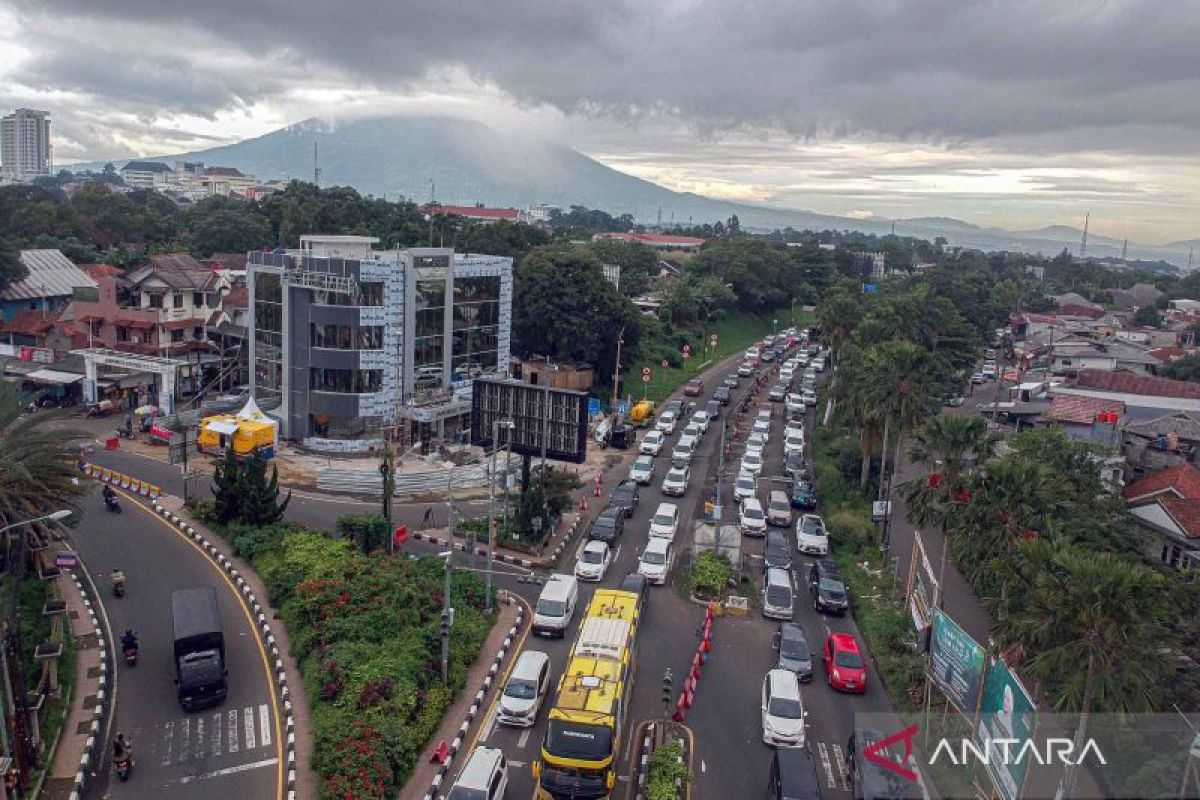 Foto udara kepadatan kendaraan menuju jalur wisata Puncak Ketika diberlakukan sistem satu arah di Gadog, Kabupaten Bogor, Jawa Barat, Rabu (25/12/2024). Menurut Satlantas Polres Bogor, terhitung dari pukul 00.00 WIB hingga 08.00 WIB sebanyak 10.200 kendaraan yang masuk kawasan puncak pada libur Natal 2024. ANTARA FOTO/Yulius Satria Wijaya/nym.