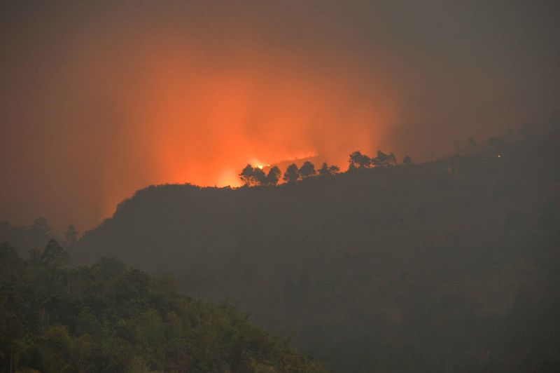 Lansekap hutan yang terbakar di Gunung Guntur terlihat dari Kawasan Cipanas, Kabupaten Garut, Jawa Barat, Selasa (20/8/2024). Data dari Dinas Pemadam Kebakaran Kabupaten Garut mencatat, kebakaran yang melanda hutan di Gunung Guntur sejak Senin (19/8/2024) petang membakar 16 hektare kawasan hutan. ANTARA FOTO/Raisan Al Farisi/Per