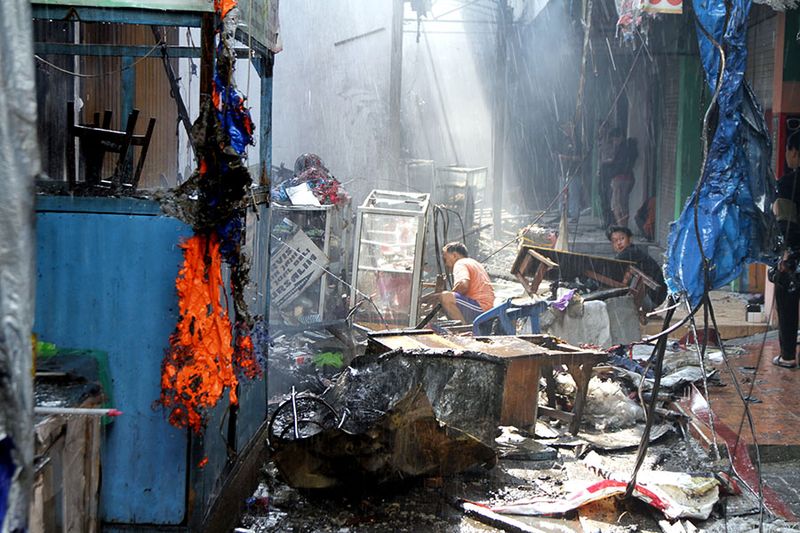 Sejumlah pedagang mengevakuasi barang dagangannya saat terjadi kebakaran di Pasar Induk Krian, Sidoarjo, Jawa Timur, Selasa (20/8/2024). Ratusan lapak permanen tersebut diperkirakan ludes terbakar dalam peristiwa kebakaran yang terjadi sekitar pukul 05:00 WIB. ANTARA/Umarul Faruq/gus