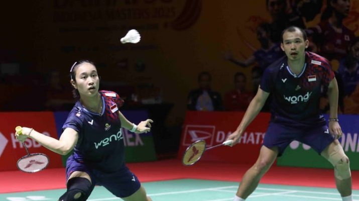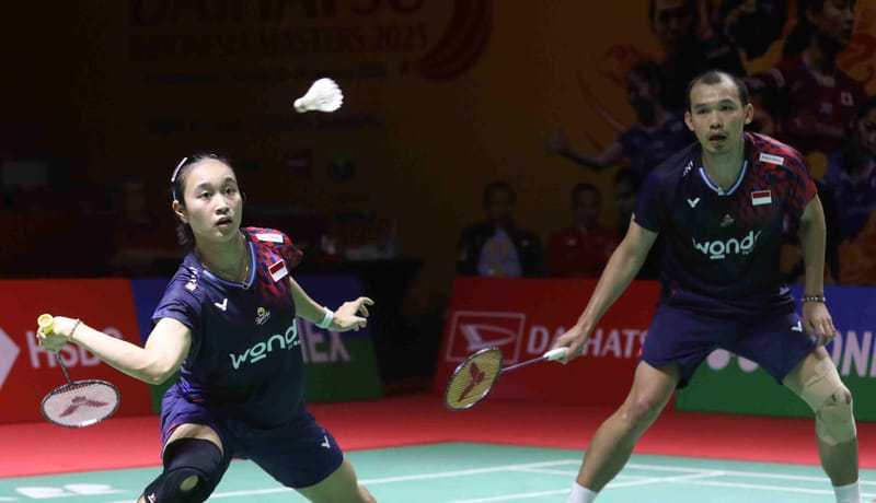 Pebulu tangkis ganda campuran Indonesia Rinov Rivaldy/Lisa Ayu Kusumawati berusaha mengembalikan kok ke arah pebulu tangkis ganda campuran Malaysia, Hoo Pang Ron/Cheng Su Yin pada perempat final Daihatsu Indonesia Masters 2025 di Istora Senayan, Gelora Bung Karno (GBK), Jakarta, Jumat (24/1/2025). Kekasih Rinov Rivaldy/Lisa Ayu Kusumawati melangkah ke semifinal setelah menang dengan skor 21-23, 21-11, 21-19. MI/RAMDANI/Per
