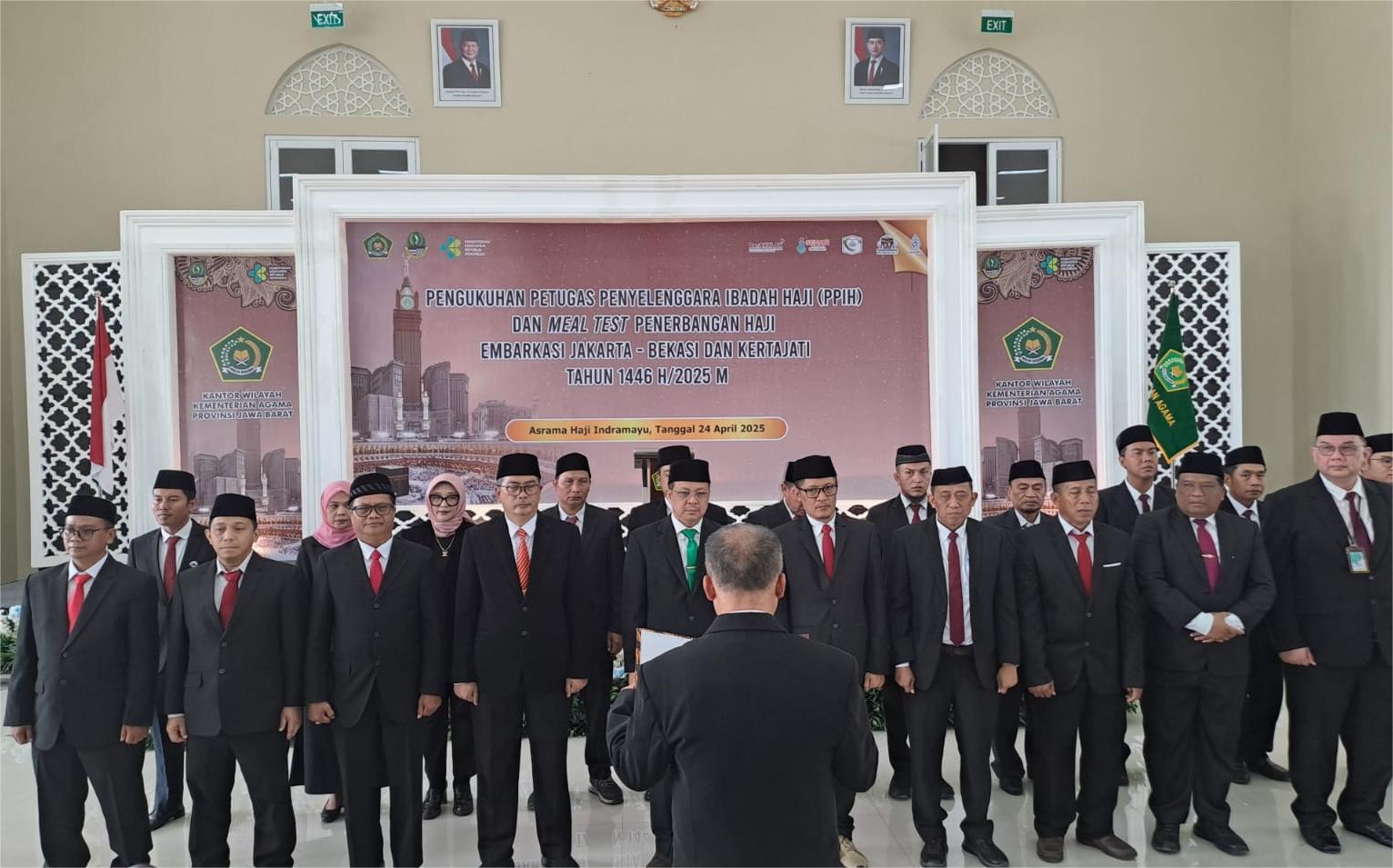 KANTOR Distrik Kementerian Religi (Kemenag) Provinsi Jawa Barat mengukuhkan Petugas Penyelenggara Ibadah Haji (PPIH). Pengukuhan dilakukan di Asrama Haji Indramayu, Kamis (24/4) oleh Kepala Kanwil Kemenag Jawa Barat, Ajam Mustajam.