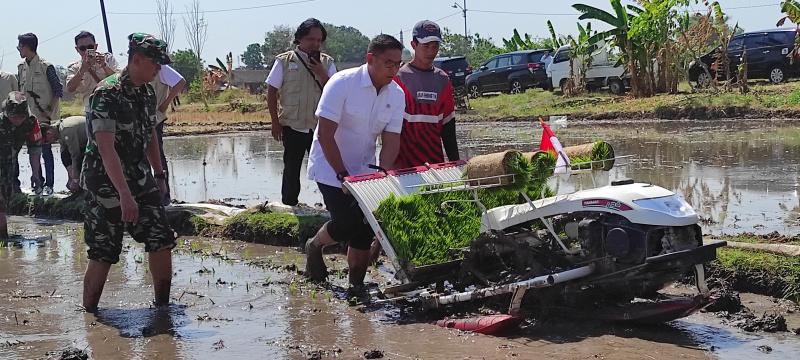Di areal persawahan Jeron, selain mengecek pompanisasi, Wamentan Sudaryono bersama Dandim Boyolali Letkol Inf Wiweko dan sejumlah petani melakukan penanaman padi, baik dengan mesin (rice transplanter) maupun secara manual di hamparan sawah setempat yang mendapatkan irigasi dari pompa air.
