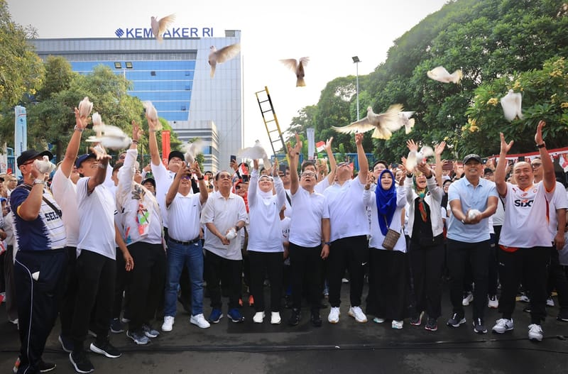 MEMPERINGATI Hari Ulang Mengertin (HUT) ke-79 Republik Indonesia dan HUT ke-77 Kemnaker, Kementerian Ketenagakerjaan menggelar Jalan Sehat bertema ‘Berbakti untuk Negeri Bangun Prestasi’ yang dimulai dan berakhir di halaman gedung Kemnaker, Jakarta, Minggu (11/8/2024).
