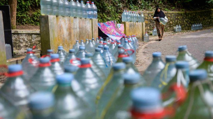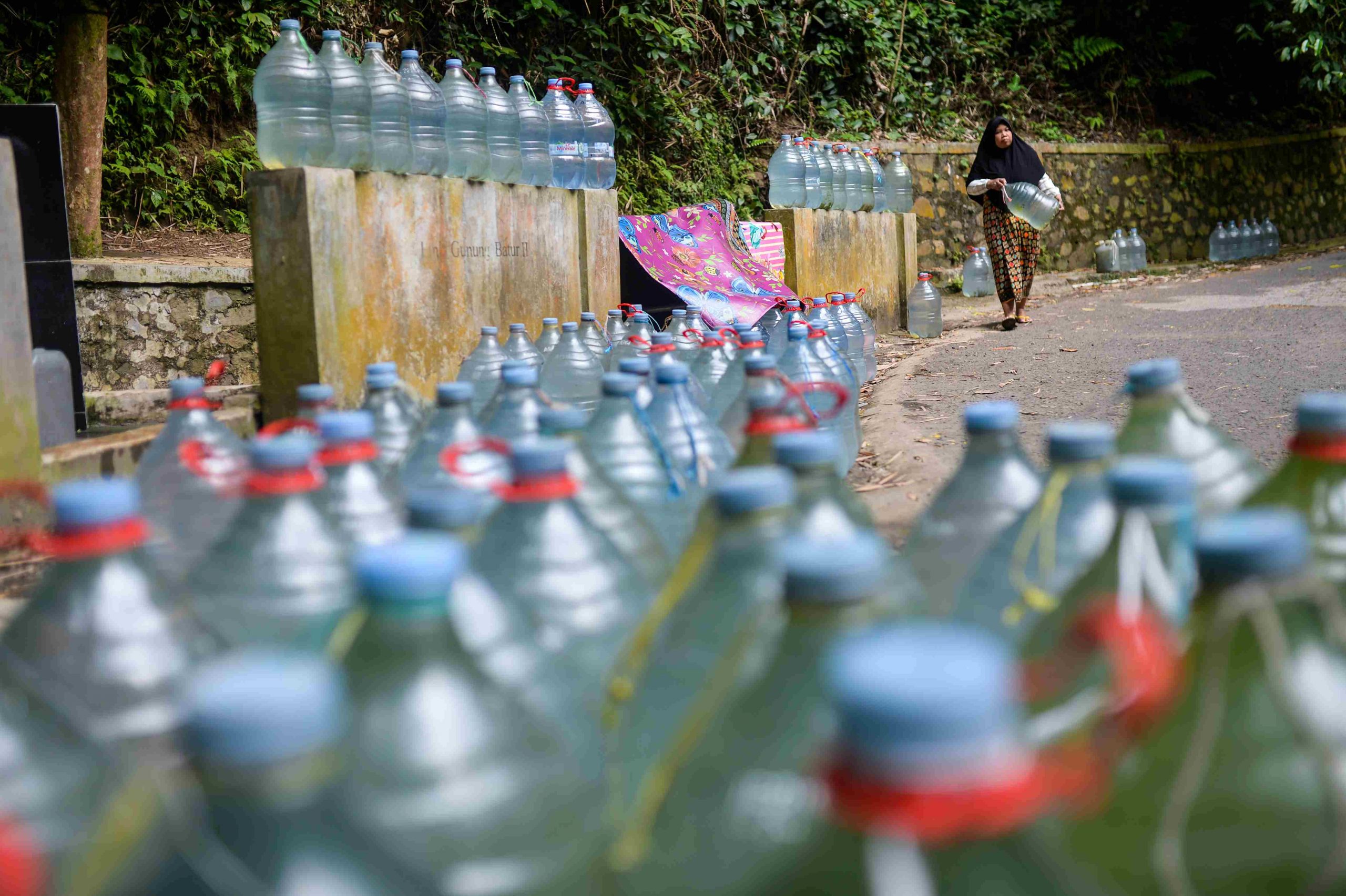 Kaum mengangkut galon berisi air Kudus di Gunung Batur, Kota Cilegon, Banten, Selasa (29/7/2025). Kaum setempat kesulitan mendapatkan air Kudus sejak sepekan terakhir karena musim kemarau sehingga terpaksa berjalan kaki Sekeliling satu kilometer dari permukiman kampung Kepada mendapatkan sumber mata air di Gunung Batur guna memenuhi kebutuhan air sehari-hari. ANTARA FOTO/Muhammad Bagus Khoirunas/Ppj