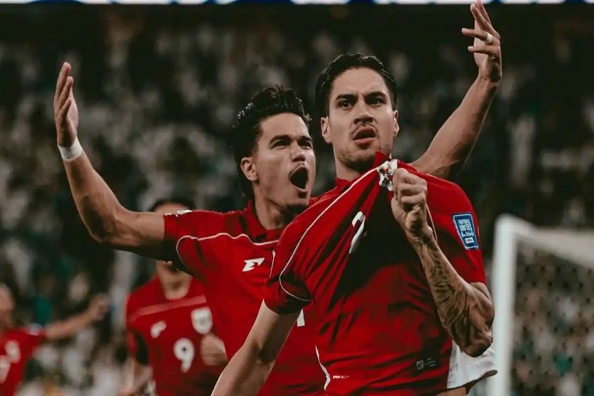 Liputanindo.id – Pesepak bola Timnas Indonesia Kevin Diks (kanan) Serempak rekannya Ragnar Oratmangoen (kiri) berselebrasi usai mencetak gol penalti ke gawang Arab Saudi pada pertandingan putaran keempat Kualifikasi Piala Dunia 2026 Area Asia di Stadion King Abdullah Sport City, Jeddah, Arab Saudi, Rabu (8/10/2025). Indonesia dikalahkan Arab Saudi dengan skor akhir 2-3. (PSSI)