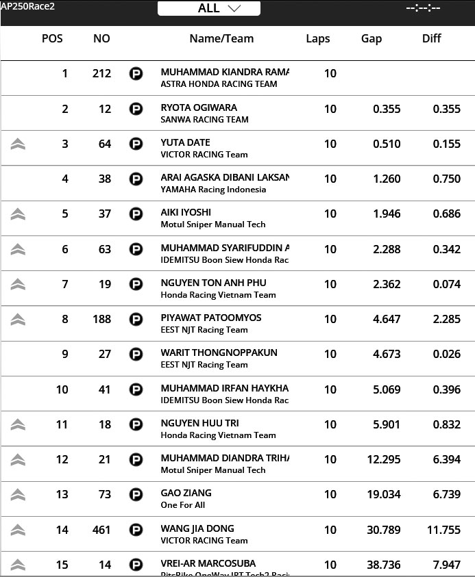 Lap 6 Arai Mmeimpin 0,3 detik di depan Herjun. Jelang tiga Lap terahir Kiandra mencoba naik kembali ke Area Podium. Lap 9 Ramadhipa Memimpin di depan Ryota Ogiwara dan Herjun. Pada awal lap terakhir Kiandra memimpin tips di depan Ogiwara, herjun, Arai, Aiki dan Yuta Date.