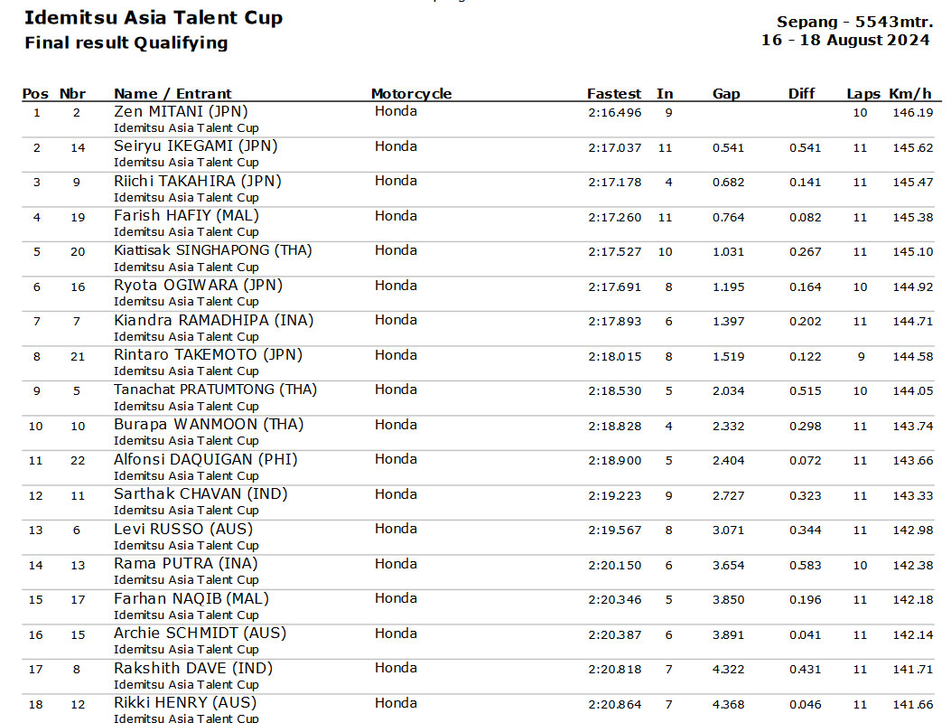 Adalah Ppmbalap Jepang – Zen Mitani yang meraih pole position dengan laptime 2:16,496 diikuti dua pembalap Jepang lainnya – Ikegami dan Takahira dan Membangun rider Jepang menguasai row terdepan Race ATC seri 2 musim 2024 ini. Kiandra Ramadhipa sendiri berada di posisi 7 dengan laptime 2:17,893 atau 1,397 detik lebih Lamban dari Mitani. Sementara itu pembalap Indonesia lainnya adalah Rama Putra yang berada di posisi start 14.