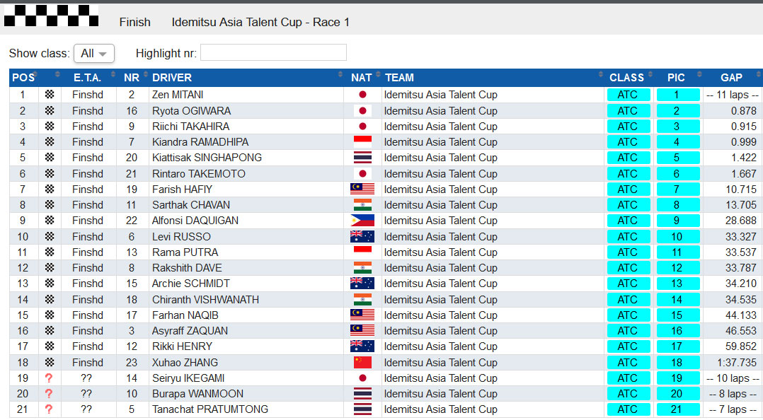 Sementara itu Race 1 yang dihelat siang ini baru saja memberikan hasil dimana Zen Mitani berhasil memenangkan balapan setelah start dari posisi pole diikuti oleh Ogiwara yang start dari posisi 6 dan Takahira dan Membangun podium Race 1 ini disapu Bersih oleh anak-anak Jepang. Ramadhipa sendiri yang fight dengan dua pembalap Jepang – Ogiwara dan Takahira Demi memperebutkan P2 akhirnya berhasil finish di posisi 4 pada race kali ini. Dhipa mengoleksi 11 poin Demi ditambahkan di tabel championship atau lebih Berkualitas dibandingkan hasil startnya dari posisi 7. Ramaputra finish P11. – @liputanindo