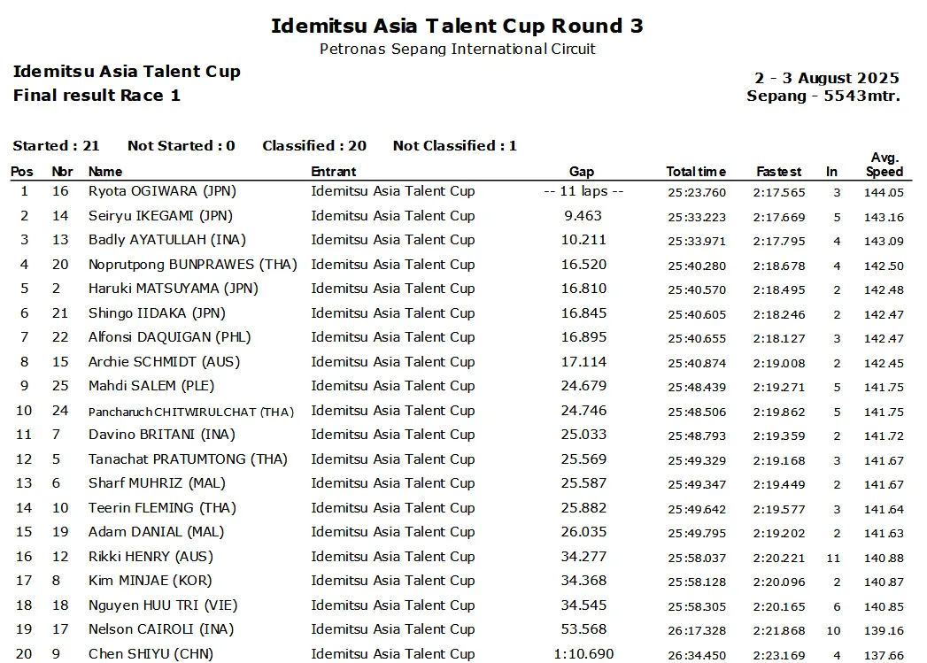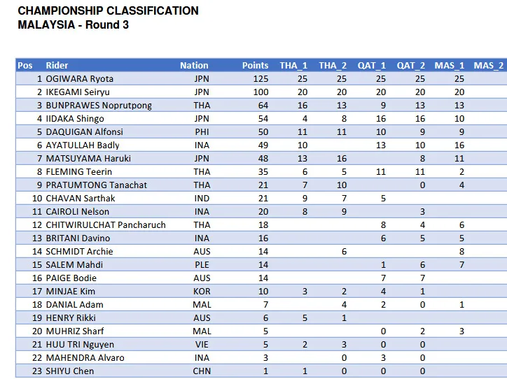 Dengan Hasil Race 1 ini Ogiwara Makin Kokoh dipuncak Klasmeen dan berjarak 25 Poin dari Ikegami di Posisi dua. Sementara Badly Ayatullah Terdapat di Posisi 6. Nelson Cairoli di posisi 11 dan Davino Britani yang raih 5 point di race ini Terdapat di posisi 13 . Kita Nantikan Serempak Hasil race 2 siang ini sob – @liputanindo