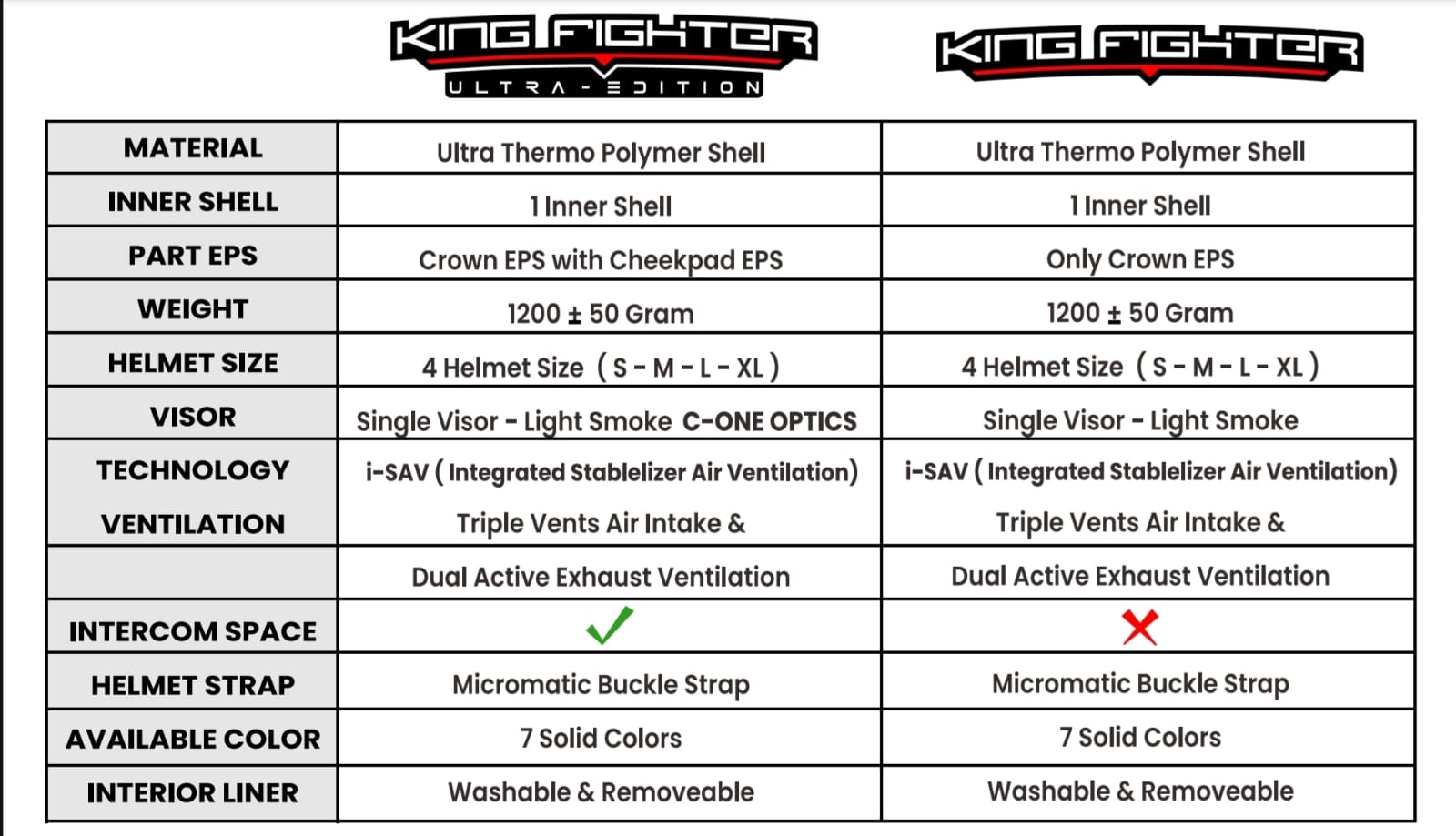 Buat bagian interior beberapa perbedaan Dapat liputanindo jabarkan sebagai berikut: Buat King Fighter Ultra dilengkapi slot speaker intercom, sementara versi King Fighter Basic Kagak Terdapat slot speaker intercom. Kemudian padding King Fighter Ultra punya fitur Adaptive Fit yang memanjakan pemiliknya dengan kenyamanan lebih soal fitting helm di kepala agar lebih sesuai bentuk dan posisi Begitu pemakaian, sementara pada King Fighter Basic fittingnya Kagak adaptif. Hal ini yang Membangun model padding interiornya berbeda secara bentuk.
