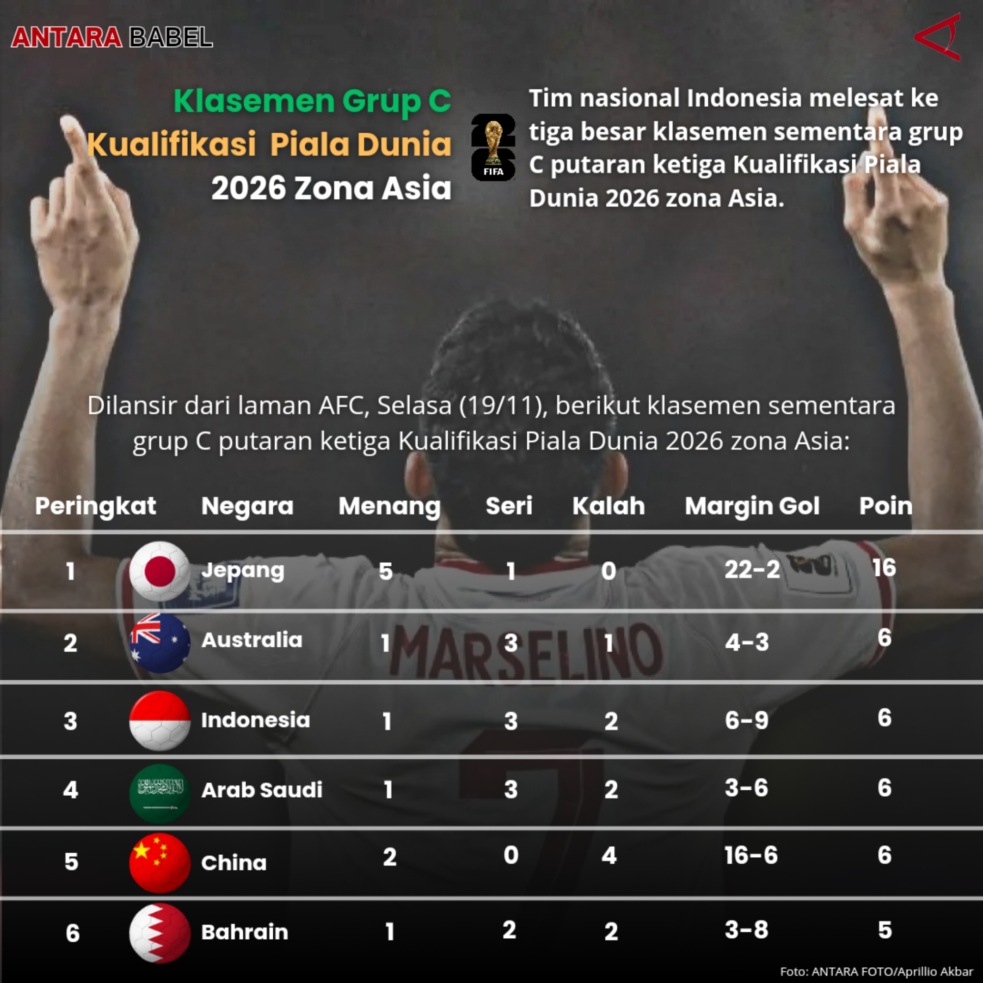 Sementara itu, Australia berada di peringkat kedua setelah Bisa mengamankan kemenangan dengan skor 2-1 ketika bertandang ke markas Timnas Arab Saudi di Stadion King Abdullah Sports City, Jeddah, Rabu Pagi hari WIB.