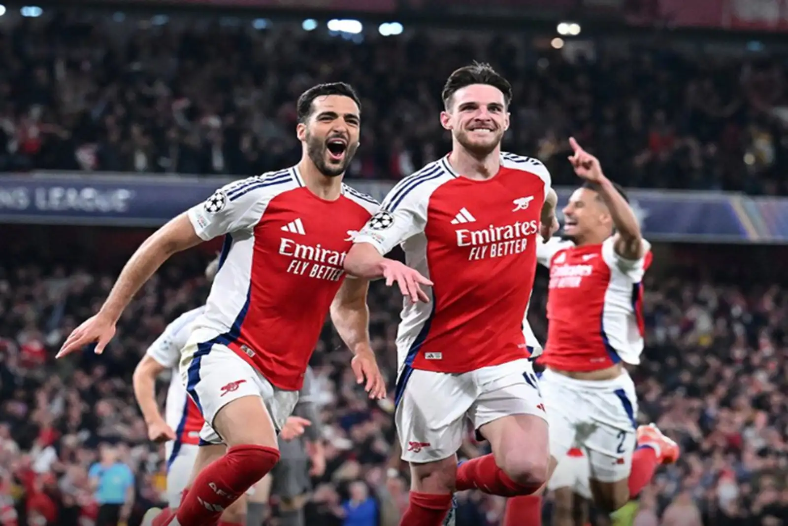 Liputanindo.id – Gelandang Arsenal, Declan Rice (kedua dari kiri), menjadi pahlawan kemenangan timnya atas Real Madrid pada perempat final leg pertama Aliansi Champions di Stadion Emirates, London, Rabu (9/4/2025) Awal hari WIB. (X/Arsenal)