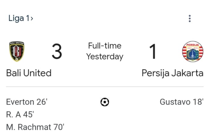 Pada menit ke-70 dan tambahan waktu sembilan menit pertandingan itu meraih skor akhir dengan kemenangan Buat Bali United 3-1 melawan Persija Jakarta. (Ant/H-3)