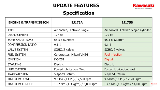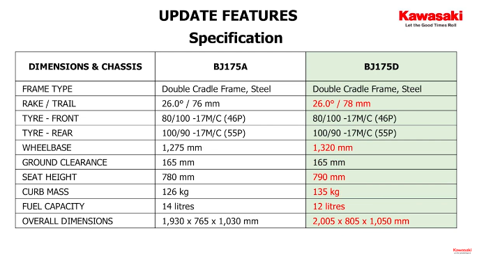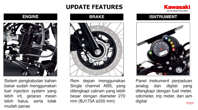 Secara Lazim spesifikasinya diperkirakan akan sama dengan sosok W175 L CBU yang Begitu pertama dirilis kena banderol harga OTR Jakarta 35,9 juta Rupiah. Begitu itu W175 L dirilis Buat menyempurnakan Kawasaki W175 sebelumnya dengan pembekalan fitur-fitur terkini, mulai dari fuel injection system, pengereman ABS, fuel meter, built-in accessories Tiba perubahan pada dimensi motor yang semakin memperkuat image retro dari klan motor ini.
