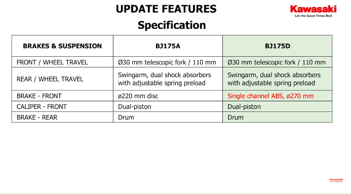 Perbedaan di suspensi depan juga lebih jenjang, cakram depan berdiameter lebih lebar dan sudah ABS single channel, tak lupa juga sasis bagian belakang ikut memanjang.